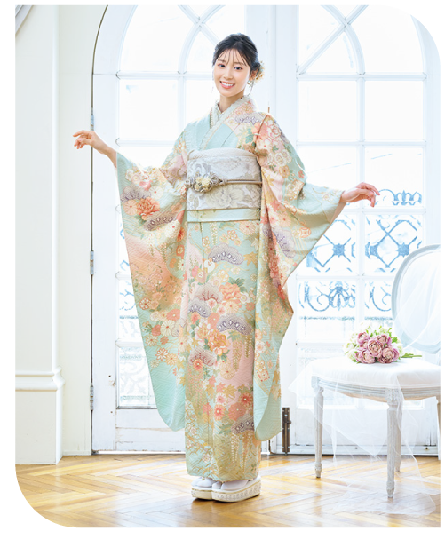 淡いミントブルーとピンクのコントラストがキュートで新鮮な印象の古典柄振袖。柔らかで優しい色調の色使いが可愛らしい着姿を演出します。身長を問わずバランスよく着こなしていただける振袖です。